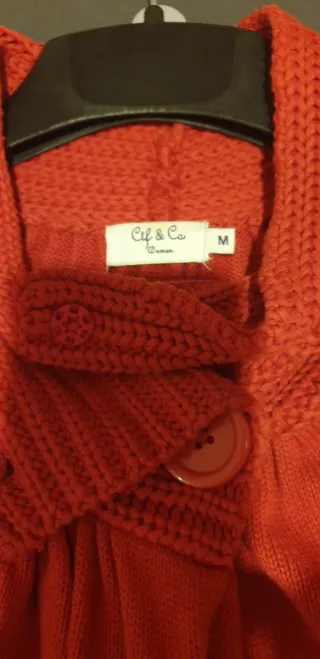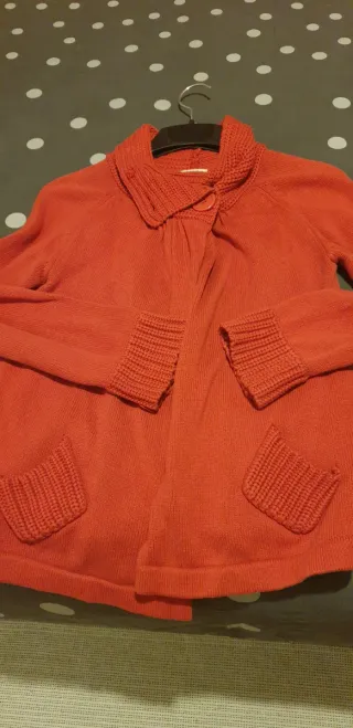 Chaqueta de punto en color coral, talla M. Confeccionada en lana, es una prenda cómoda y estilosa. - Diseño con cuello alto. - Cierre de botón. - Bolsillos delanteros.