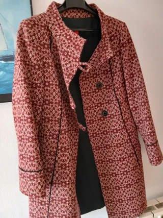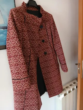 Abrigo fino con un bonito estampado geométrico. Pone talla 42 pero es pequeña, puede pasar por una M. - Tejido de lana y algodón. - Diseño con cuello barco - Cierre de botones.