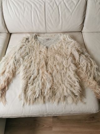 Preciosa chaqueta de pelo largo. Color camel con mezcla en rosa empolvado. En las imágenes no se llega a apreciar bien lo bonita que es. De lana y con pelo. Muy práctica. Está nueva. Puesta en 3 ocasiones. Precio 35€.