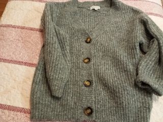 Cárdigan de lana gordita pero sin peso, de tacto suave. Está nueva sin estrenar y por lo tanto no tiene bolitas. Poliéster 28%, poliamida 38% y acrílico 32%.