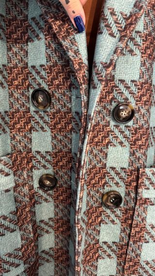 Abrigo de lana con un diseño de cuadros llamativo. Ideal para añadir un toque de estilo a tu vestuario. - Diseño de cuadros en tonos teja y verde azulado. - Cierre de doble botón. - Bolsillos frontales.