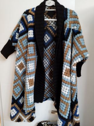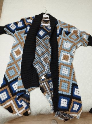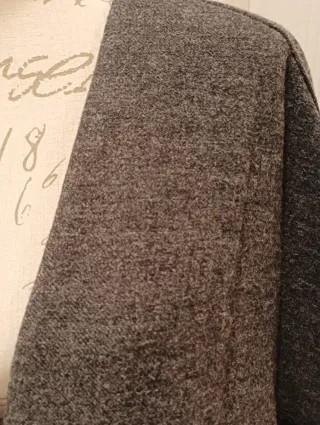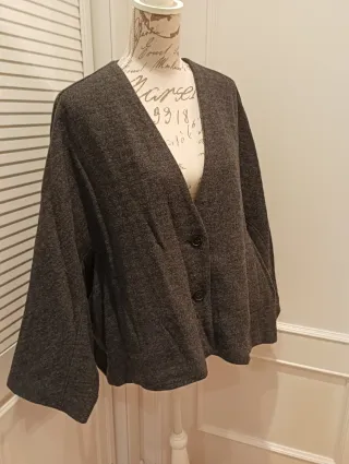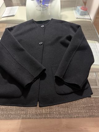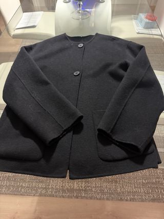 Abrigo de punto no muy grueso pero calentito, ya que tiene lana en su composición. Es amplio y está impecable ya que solo se ha estrenado. - Cuello solapa. - Dos bolsillos frontales. - Cierre de botones.