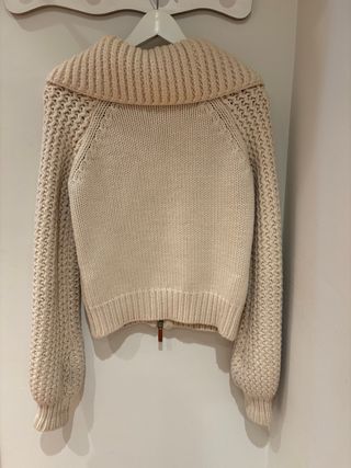 Chaqueta de lana gruesa con cremallera frontal y cuello alto. - Diseño de punto grueso. - Mangas con textura. - Cremallera con opción de apertura inferior. - Detalle de logo en la parte inferior.