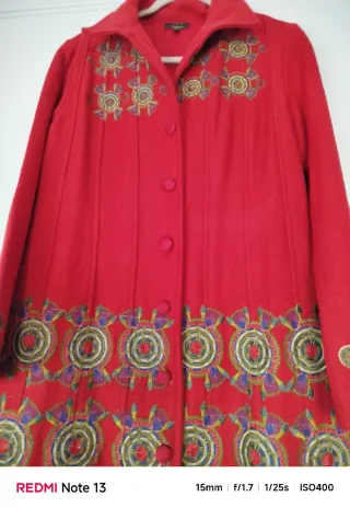 Abrigo de lana 70% marca Niza Moda, talla XL. Color rojo intenso con bordados étnicos en delantero, mangas y espalda. Perfecto para bodas, comuniones, Navidad o eventos especiales. #abrigofiesta #abrigoceremonias