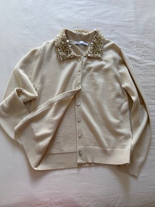 Precioso cárdigan de Zara de alta calidad 62 % Lana 🧶 y 38 % Algodón . •Color Beige con un diseño único en el cuello, perfecto para aportar un toque sofisticado y femenino a cualquier conjunto. • Cuello adornado con apliques y delicados detalles. • Cierre frontal con botones de nácar. • Interior abrigado, ideal para los días fríos. ✨ Una prenda sofisticada, elegante y muy confortable, perfecta para completar un look distinguido. Sin Estrenar. Totalmente Nuevo