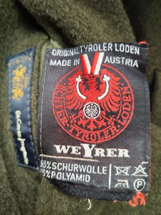 Chaquetón Loden original austriaco, marca WEYRER. Talla 50 (L). Reversible verde / beige tipo gabardina. 85% lana virgen, 15% poliamida. Made in Austria. Medidas: 54 cm axila 80 cm largo 74 cm manga desde cuello Un lado en loden clásico verde oscuro (lana prensada) Un lado en tejido liso tipo gabardina en tono beige Estado muy bueno lado verde de lana El lado beige tiene roce en mangas y necesita limpieza → precio reducido por este motivo. Prenda vintage auténtica de muy buena calidad. EXCEPCIONAL REVERSIBLE #reversible #loden #austriaca