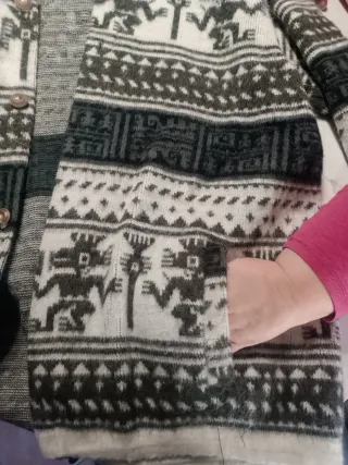 Abrigo de punto con diseño artesanal de lana cruda de Ecuador. Presenta un patrón geométrico y figuras inspiradas en la cultura andina. - Tejido de lana cruda. - Diseño de figuras y grecas. - Cierre de botones.