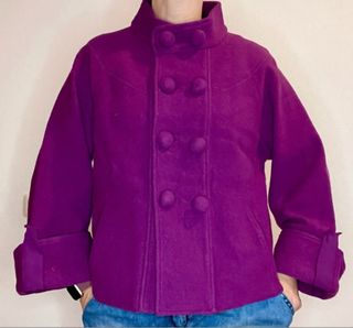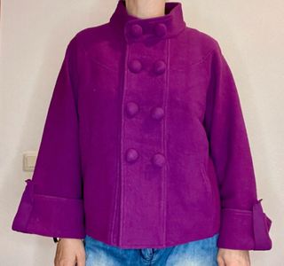 Chaqueta de lana de color fucsia intenso o guinda de Purificación García. Detalles del Diseño Marca: Purificación García. Color: Fucsia / Morado intenso. Material: Principalmente confeccionado en lana, lo que lo hace ideal para climas fríos. Estilo: Presenta un cuello alto tipo Mao y un cierre frontal de doble botonadura con botones forrados en el mismo tejido. Las mangas son de corte amplio con puños vueltos, aportando un toque elegante y estructurado . Talla L Mide; de hombro a hombros 42 cm, de axila a axila 56 cm, manga 54 cm, largo 58 cm.