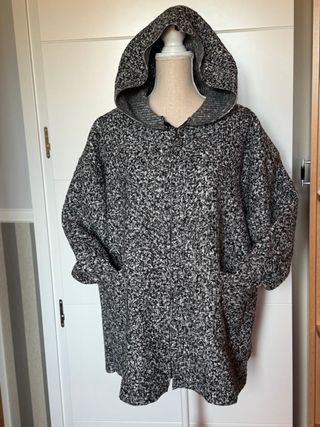 Abrigo con un diseño moderno, cómodo y fácil de combinar, ideal para el día a día. Presenta un estampado jaspeado en tonos grises y negros, en un tejido de poliéster con un porcentaje de lana y ligeramente elástico. - Capucha integrada. - Cierre de cremallera frontal. - Bolsillos laterales. Un solo uso, como nuevo. Talla 44/46 (medidas en fotos).