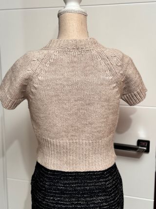Bolero de punto de la marca Massimo Dutti. Tejido de calidad mezcla de lana, alpaca y acrílico. - Manga corta. - Cierre delantero con gancho. - Diseño de trenzas en la parte frontal. - Cuello redondo. Usado una sola vez, impecable.