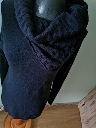 En azul marino, lana, muy abrigado. Elástico. El cuello hace ochos en punto de lana, con múltiples formas de poner, no agobia. Nuevo. Talla L/XL