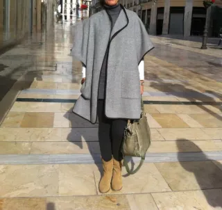 Capa gris con ribete marrón, de Zara. 2 bolsillos. Es talla M pero válida también para L y XL. 45% lana, 25 viscosa, 30 poliéster. Precio original 89'95 Euros. En muy buen estado.