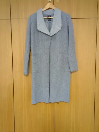 Abrigo largo de tejido gris, ideal para añadir un toque elegante a tu vestuario. - Diseño de corte recto. - Cuello solapa. - Bolsillos frontales. - Tejido como de lana, abriga bastante.