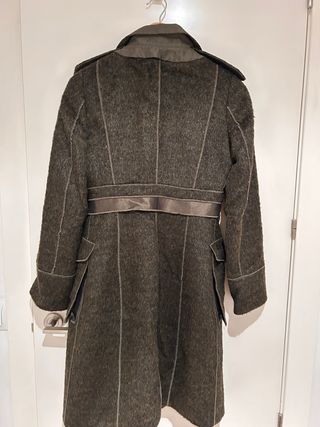Abrigo de tres cuartos en un bonito tono verde musgo. Presenta un diseño elegante y atemporal. - Tejido de lana con acabado texturizado. - Cinturón a juego para ajustar la silueta. - Bolsillos frontales. - Cuello con solapas y hombreras.