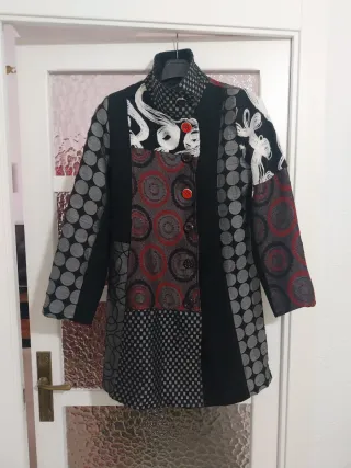Precioso abrigo 3/4 patchwork Made in Italy, 30% lana, con bolsillos y cuello adaptable. Cierre con botones grandes decorativos. Para tallas 36 y 38 ajustada (en etiqueta pone XL pero no es correcto). Con muy ligeros signos de desgaste que prácticamente no se aprecian. - Medidas en plano: largo 88cm/pecho 49cm/mangas 59cm/hombros 40cm