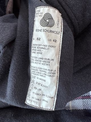 Chaqueta masculina Bogner confeccionada en 100% lana virgen natural, con acabados en piel de cordero tipo nubuck. Prenda de alta calidad, cálida y elegante. Talla: EU 52 / US 42 Según las medidas, corresponde aproximadamente a una XL. Medidas (aprox.): • Largo: 87 cm • Largo de manga (desde la costura): 62,5 cm • Ancho de pecho (de axila a axila, medido por fuera): 70 cm Estado: Muy bueno. Presenta ligeros signos de uso en el forro de las mangas, visibles únicamente al darle la vuelta a las mangas. Una de las cremalleras está un poco dura: abre y cierra, pero requiere algo de esfuerzo. No hay agujeros, roturas ni defectos impo