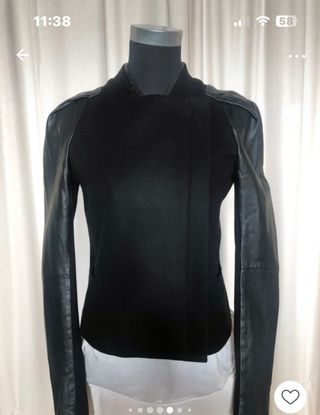 Chaqueta de diseño elegante con mangas de cuero. - Combinación de lana y cuero. - Cierre asimétrico con cremallera. - Detalle de solapas. - Hombreras.
