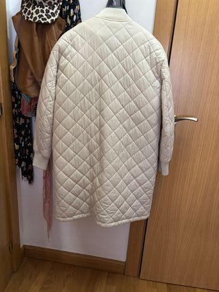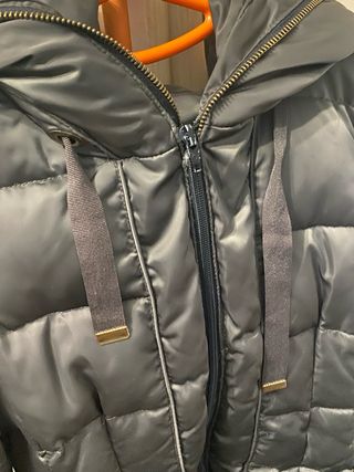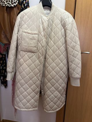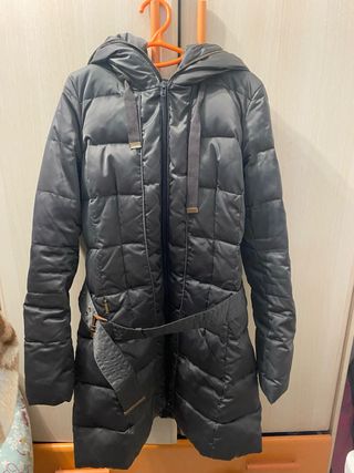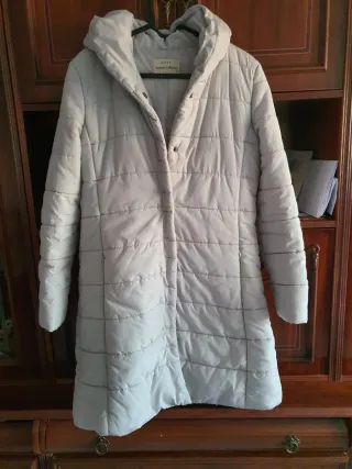 Abrigo largo acolchado de la marca Zara. Presenta un diseño moderno y elegante, ideal para el frío. - Cierre de cremallera. - Cinturón ajustable a la cintura. - Capucha integrada. - Bolsillos laterales. Tiene un pequeño desgaste en el bolsillo, pero fácil de arreglar