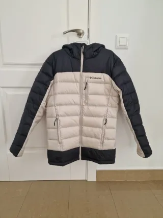 Abrigo acolchado de la marca Columbia, perfecto para el frío. - Diseño bicolor en beige y negro. - Capucha integrada. - Cremallera frontal. - Bolsillos con cremallera.