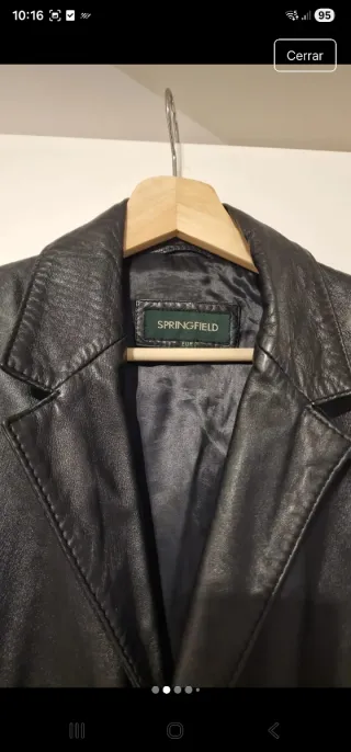 Abrigo largo de piel negra auténtica de la marca Springfield. Corte clásico tipo americana con solapa y cierre de tres botones. Bolsillos delanteros con solapa y forro interior suave. Perfecto para un look urbano o formal en otoño e invierno.