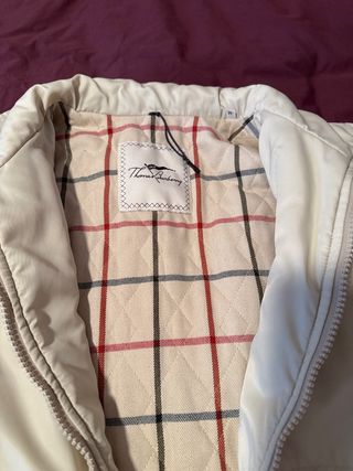 Abrigo de la marca Thomas Burberry con un diseño clásico y forro a cuadros. - Forro interior acolchado con estampado de cuadros. - Cierre de cremallera frontal. - Cuello alto. Falta la capucha de la cremallera del cuello