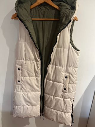 Abrigo largo de la marca Zara, modelo actual en tienda. Color beige y talla L. - Diseño acolchado. - Capucha. - Cierre de cremallera y botones. - Bolsillos laterales.