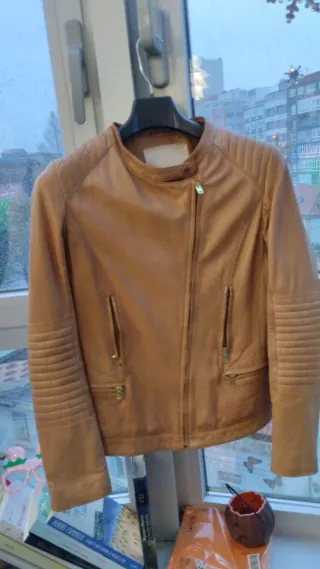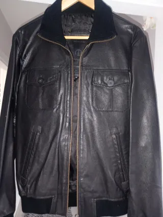 Chaqueta de cuero de la marca Cortefiel. Pequeño raspado en el cuello, visible en la foto - Diseño clásico con botones dorados. - Dos bolsillos frontales con solapa y botón. - Cuello camisero. -Piel