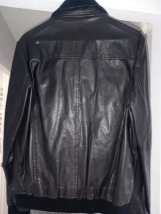 Chaqueta de cuero estilo bomber de la marca Jack & Jones. **Tiene unos pequeños desgastes en manga derecho supongo que debido a una doblez al estar colgada en el armario durante algún tiempo. - Cuello de canalé. - Cierre de cremallera. - Dos bolsillos en el pecho con botón. - Dos bolsillos laterales. - Puños y bajo elásticos.