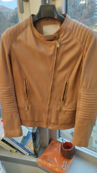 Cazadora estilo biker de la marca Uterqüe. - Diseño de piel. - Color marrón. - Cremallera asimétrica. - Detalle de costuras en hombros y mangas.