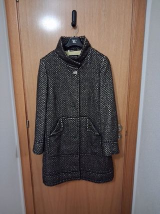 Elegante abrigo de la marca Escada Sport. - Diseño tejido en espiga. - Detalles en hilo dorado. - Cuello alto. - Bolsillos frontales. - Puños y bajo con pespuntes decorativos.