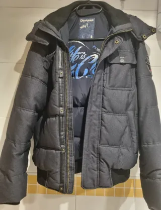 Abrigo - Chaqueta de la marca DESIGUAL con un diseño moderno y llamativo. Perfecta para añadir un toque de estilo a tu look. - Original - Talla M (recomendada para hombres de 160 cm - 170 cm). - Estampado interior con texto. - Cuello con detalle de tejido diferente. - Cierre de cremallera frontal.