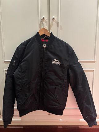 Chaqueta bomber negra de la marca Lonsdale. - Cuello y puños elásticos. - Cierre de cremallera frontal. - Bolsillos laterales con botón. - Detalle de logo en el pecho.