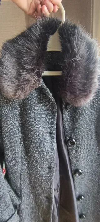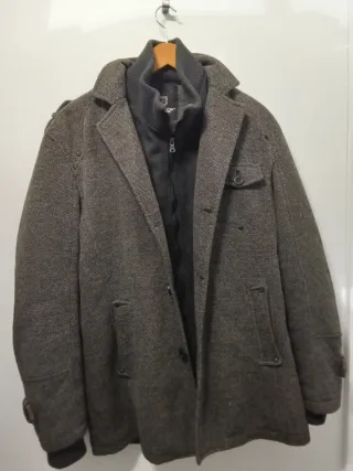 Abrigo de la marca El Ganso en tonos grises y negros. Presenta un diseño elegante y versátil. - Tejido de espiga. - Cierre de cremallera interior. - Detalle de pespuntes rojos. **Se puede lucir un look más informal y abrigado gracias a su frente de plumas en color marrón con cremallera o una combinación mas formal sin él** (la prenda marrón no es una pieza completa, únicamente una pechera con cuello alto)**. Por tratarse de un regalo tiene recortado el precio de compra en la etiqueta, pero se puede comprobar en los otros dos abrigos en venta de la misma colección que fue 199€.
