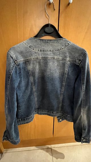 Chaqueta vaquera con un diseño único y detalles elegantes. - Cuello redondo adornado con perlas y pedrería. - Cierre de botones metálicos. - Dos bolsillos en el pecho con solapa y botón. - Puños abotonados.