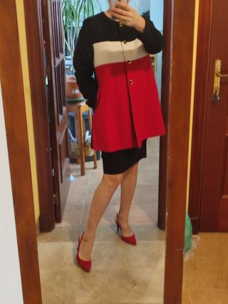 Espléndido abrigo primavera Zeila, alta costura, tricolor rojo-negro-blanco, forro, mangas largas, bolsillos y un corte tipo capa ideal. En excelente estado. Excelente calidad y marca, fácil de combinar, elegante y original. Queda espectacular! Las medidas y composición en las fotos. 38-40