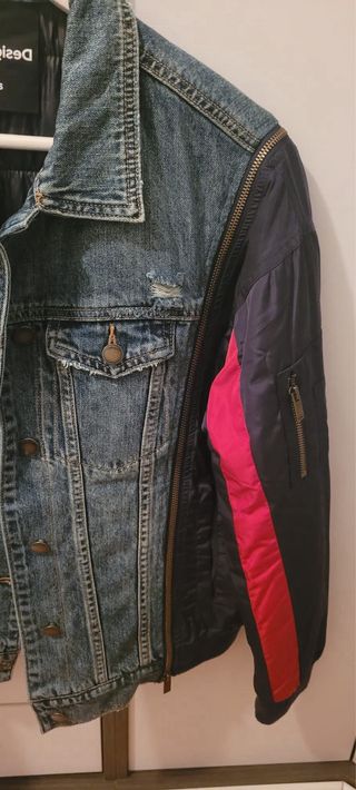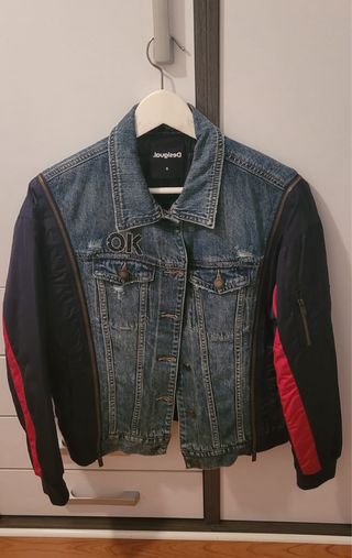 Cazadora vaquera de la marca Desigual con detalles en contraste. - Diseño con mangas de tejido técnico. - Cierre de botones metálicos. - Bolsillos delanteros con solapa. - Detalle de pedrería OK en la zona del pecho.