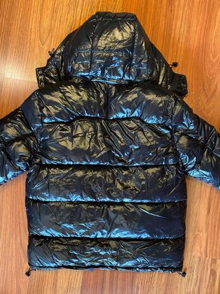 Abrigo de caballero de la marca Zara, muy calentito y con capucha. - Color azul marino y negro. - Diseño acolchado. - Cierre de cremallera y botones. - Bolsillos frontales con cremallera. Capucha desmontable, bolsillos de pelito, muy poco uso en perfecto estado