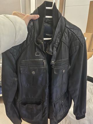 Chaqueta de la marca Springfield de cuero en color negro. - Cuero - Diseño acolchado en hombros. - Cuello alto con acabado de canalé. - Múltiples bolsillos frontales con solapa y cremallera. - Cierre principal de cremallera.
