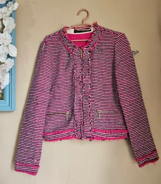 Chaqueta de la marca Zara con un diseño vibrante. - Tejido texturizado con rayas finas. - Detalle de flecos en cuello y puños. - Cremallera frontal. - Bolsillos con cremallera.