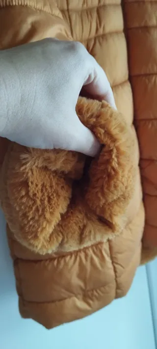 Color caramelo, con gorro y bolsillos con cremallera interiores y exteriores. Por fuera acolchado e impermeable para uso diario y por dentro de pelito Muy elegante, para ir más arreglada o salir de fiesta. Súper cálido para personas frioleras, por este motivo sólo se ha usado 3veces. Tacto súper suave, la sensación es de estar envuelta en una mantita de coralina. Marca no conocida, talla 46 equivalente a una talla 42-44, ya que es grueso por dentro, pero admite meterse un jersey. Tiene un pequeño agujero en el forro de un bolsillo por haberse enganchado con una llave, adjunto foto. Comprado por 54€ en tiendas Kira. Precio negociable