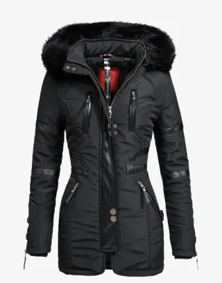 Abrigo de la marca Navahoo para mujer en color negro. Diseño moderno y elegante. Solo usado 2 veces ( está nuevo) - Capucha con pelo sintético. - Cierre de cremallera. - Bolsillos frontales con cremallera. - Detalles en polipiel en mangas y frontal. - Puños ajustables con botones.