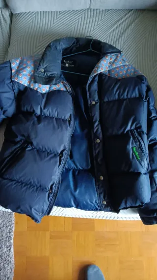 Abrigo original Hackett London para hombre, talla L. Diseño clásico y elegante, ideal para invierno. Exterior en mezcla de algodón (35 %) y poliéster (65 %) con acolchado de plumón de pato gris (80 %) y pluma (20 %), muy cálido, ligero y de excelente calidad. Color azul marino. Cierre con cremallera y botones. Múltiples bolsillos exteriores e interiores. Puños ajustables. En muy buen estado, sin manchas ni roturas. 📏 Talla: L (equivale aprox. a 52) 🪶 Relleno: Plumón de pato y pluma natural 🏷️ Marca: Hackett London 📍 Entrega en mano en Mirasierra (Madrid) 🚫 No envío 💶 Precio: 147 € (negociable)