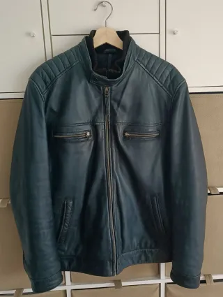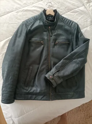 Chaqueta de cuero estilo motero, un clásico de 1995. Creo que es piel porque no está nada dañada después de tantos años. Pone talla 4, se compró para un chico de 16 años. Mide 60cm de sisa a sisa y 44 de hombros. Desconozco la marca pero costó unas 20.000 pesetas en su momento. - Diseño con cremalleras plateadas. - Detalles de tachuelas en los hombros. - Cinturón con hebilla en la parte inferior.