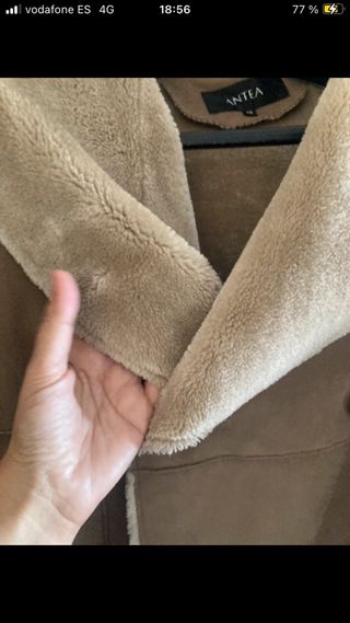 Abrigo largo de la marca ANTEA en color beige, con un forro interior de borreguito que aporta calidez. - Diseño de doble botonadura. - Cuello amplio con solapa. - Puños y bajo con detalle de borreguito. - Bolsillos laterales.