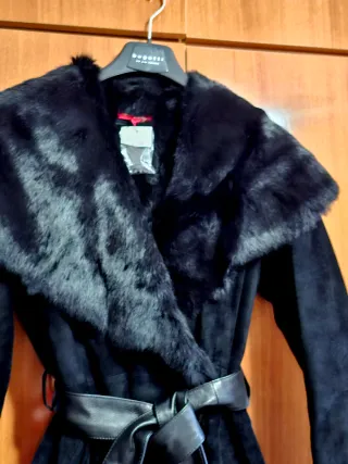 Elegante abrigo de piel para mujer de la marca Andrés Derhy. Un diseño sofisticado y cálido. Piel vuelta y gran cuello, puños y parte interior superior de piel de conejo. Parte interior inferior acolchado Ce cierra con lazada interior y corchetes bordados junto con un bonito cirturon exterior anudado. Lleva bolsillos exteriores Talla M amplia. Sin estrenar y con etiqueta - Material exterior de piel. - Detalle de pelo en cuello y puños. - Cinturón de piel para ajustar la silueta.