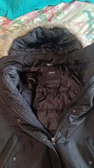 Abrigo de la marca ONLY, en color negro y sin estrenar. - Capucha con pelo. - Cierre de cremallera. - Bolsillos laterales.
