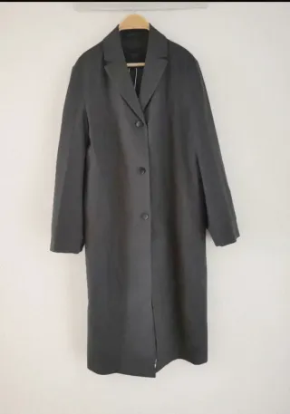 Abrigo largo estilo levita de la marca Zara en color gris antracita. Un básico elegante para cualquier ocasión. Confeccionado en algodón y lino. - Cierre de botones. - Cuello solapa. - Bolsillos laterales.