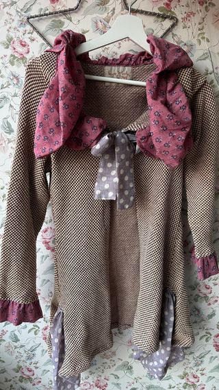 Chaqueta de la marca Ian Mosh con un diseño único. - Tejido texturizado en tonos beige y burdeos - Detalle de volantes en color rosa en puños y cuello. - cierre delantero con un lazo de lunares q es igual q los detalles laterales