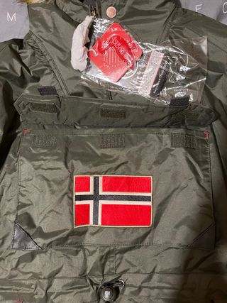 Abrigo de Geographical Norway talla M en color verde. Presenta un diseño moderno y funcional, con capucha y detalles distintivos de la marca. - Capucha con pelo sintético que se puede quitar - Cierre de cremallera y solapa. - Bolsillos frontales con solapa. - Parche de la bandera de Noruega en el pecho. - Puños ajustables.