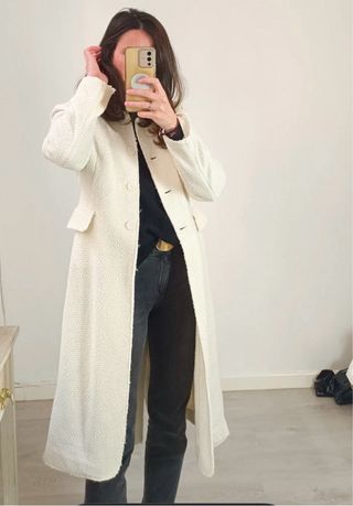 Abrigo de la marca Zara, en color blanco roto. Es una prenda nueva, sin etiquetas. - Diseño elegante y atemporal. - Tejido texturizado de alta calidad. - Cierre con botones. - Bolsillos frontales.